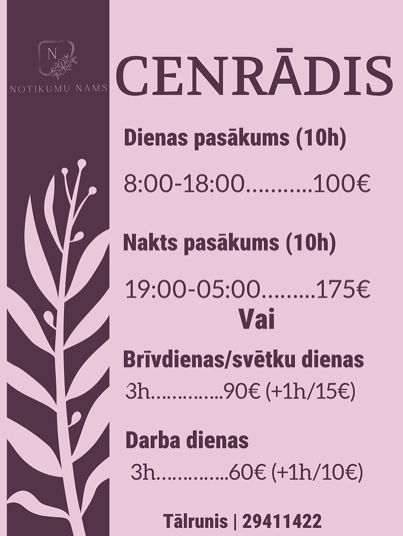 Brīvdienu/ svētku dienas (3h) – 90.00 eiro (+1h/15.00 eiro).