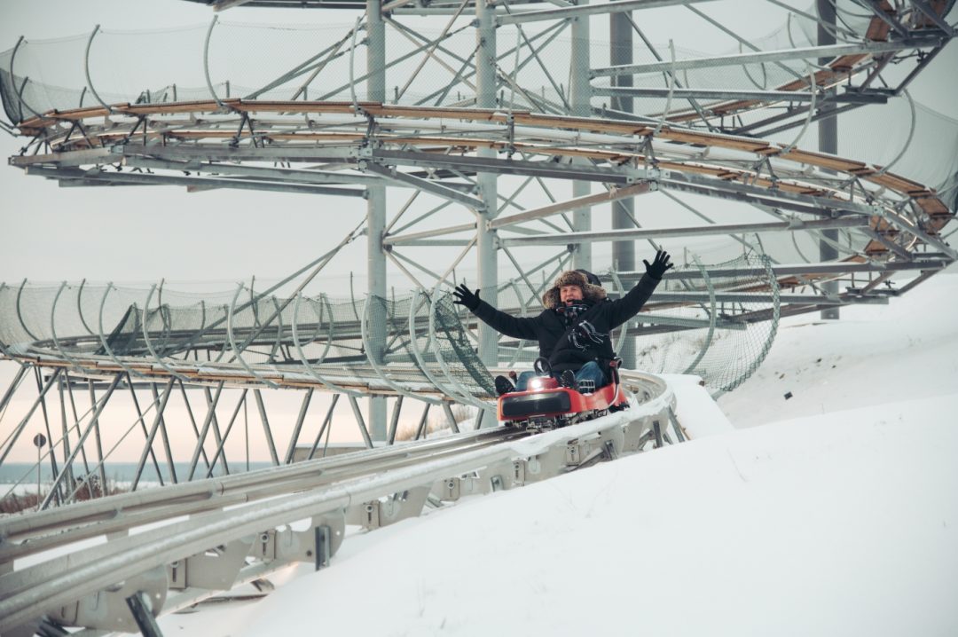 Īpaši aizraujoši skati no Rodeļu trases un kalna virsotnes paveras tieši vakara tumsas stundās! Rodeļu trases nobrauciens ir 580 m garš ar 360 grādu virāžām.