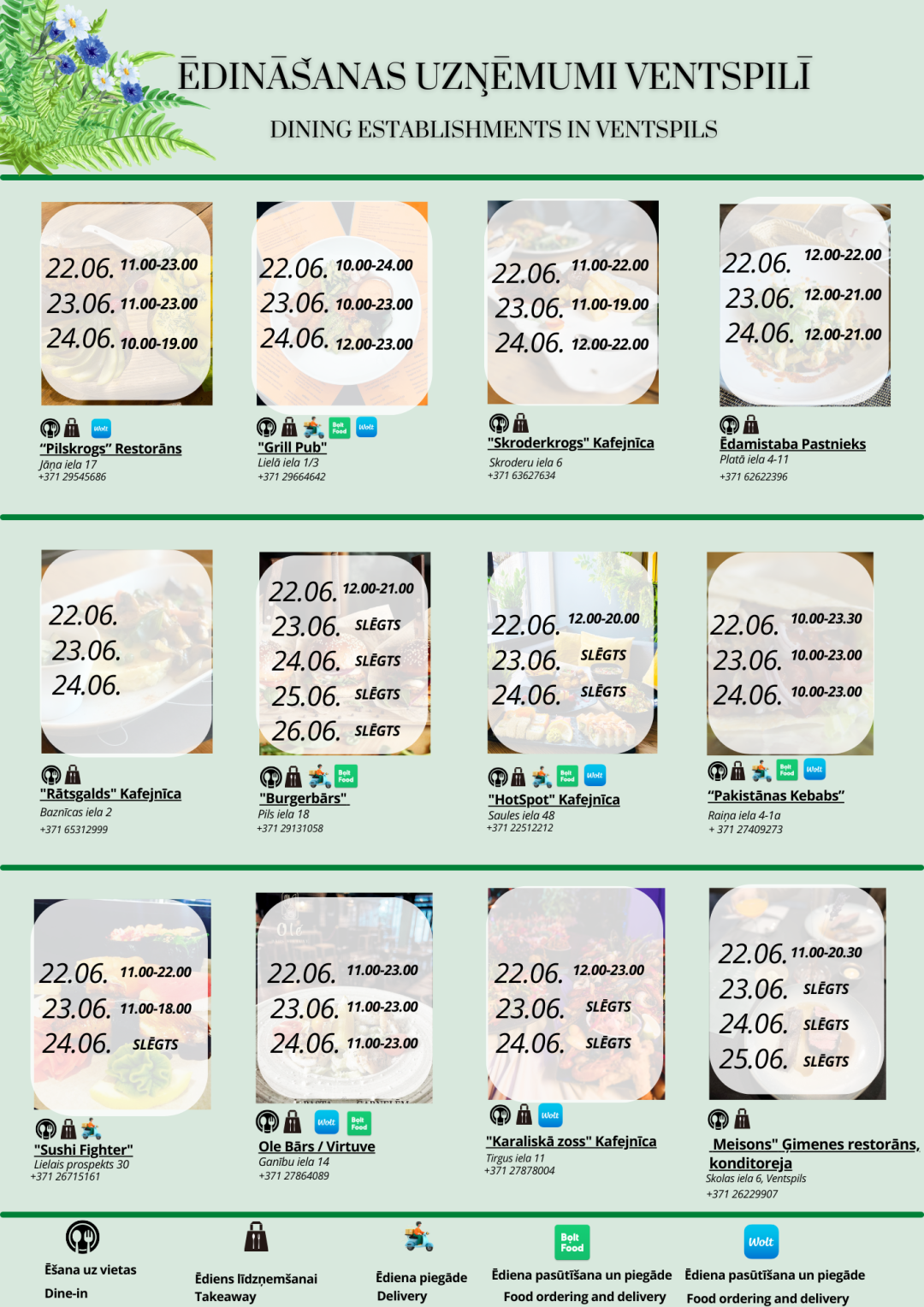 Ventspils Tūrisma informācijas centrs (Dārzu iela 6): 30.04.2024 08.00-17.00 01.05.2024 10.00-15.00 02.05.2024 08.00-18.00 03.05.2024 08.00-18.00 04.05.2024 10.00-15.00 05.05.2024 10.00-16.00 06.05.2024 10.00-16.00 Zinātnes centrs VIZIUM (Rūpniecības iela 2) 30.04.2024 10:00 –…