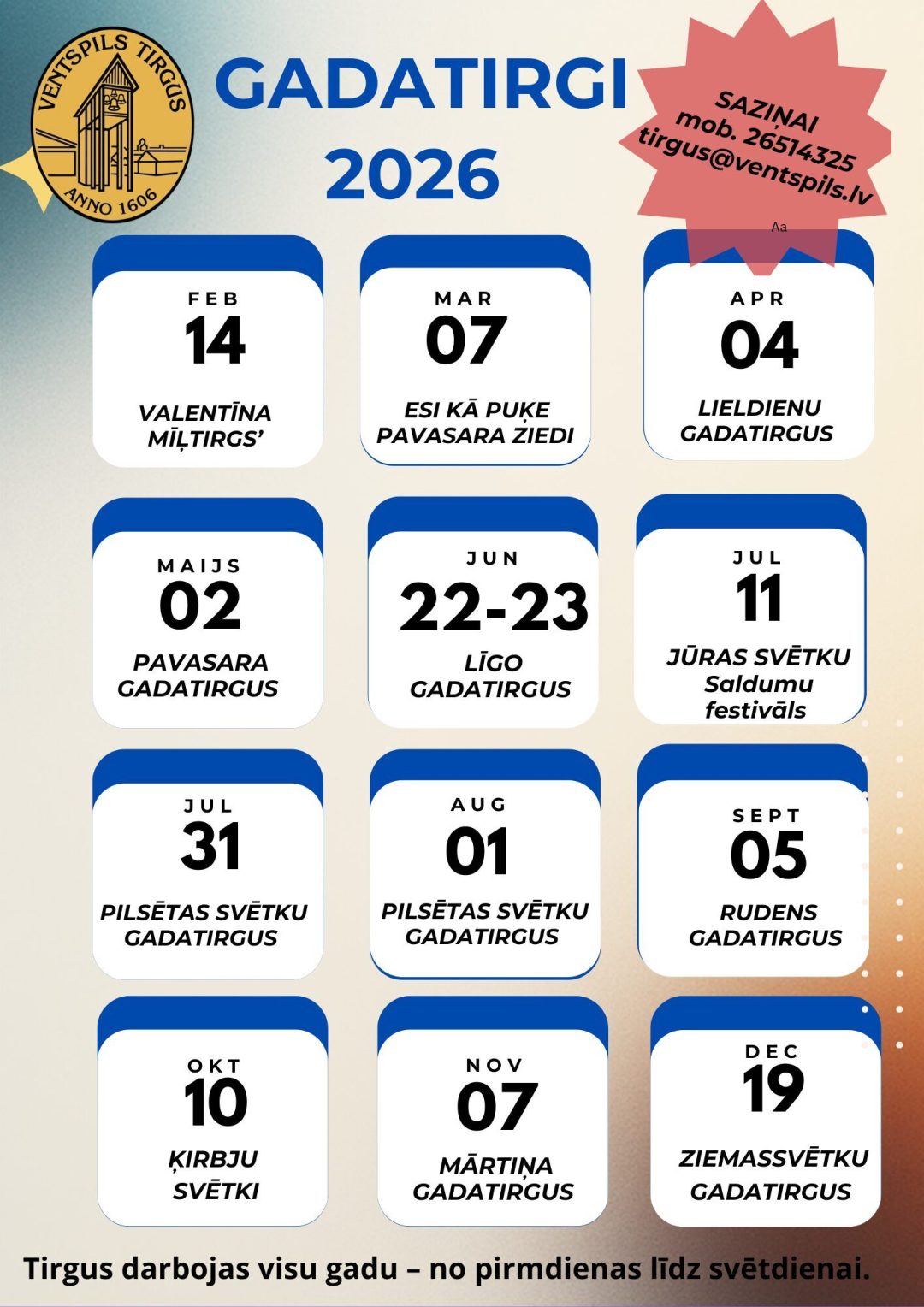 Piedāvājam tirgotājiem un apmeklētājiem iepazīties ar 2026. gada gadatirgu kalendāru, lai savlaicīgi varētu  plānot savu dalību vai apmeklējumu. Tirgošanās Gadatirgi un svētku tirgi ir īpaši notikumi, kuros ierastais tirgus piedāvājums tiek paplašināts.