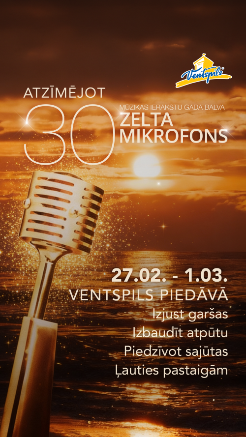 28. februārī Olimpiskajā centrā “Ventspils” norisināsies krāšņa un svinīga Latvijas mūzikas ierakstu gada balvas “Zelta Mikrofons” 30 gadu jubilejas ceremonija. Lai pilsētas viesiem šo notikumu būtu ērti apvienot ar atpūtu Ventspilī, Tūrisma informācijas centrs ir sagatavojis piedāvājumu apkopojumu, kuru iespējams lejupielādēt šeit. Lai “Zelta Mikrofona” apmeklētāji un citi pilsētas viesi Ventspilī varētu pavadīt pilnvērtīgu nedēļas...