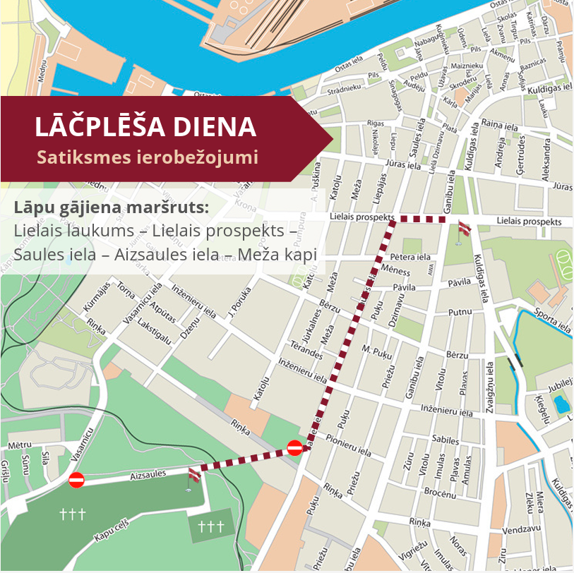 No plkst. 17:45 līdz plkst. 18:30 īslaicīgi satiksmes ierobežojumi gājiena maršrutā: Lielais laukums – Lielais prospekts – Saules iela – Aizsaules iela – Meža kapi pie Baltā krusta (karte lejupielādējama šeit).