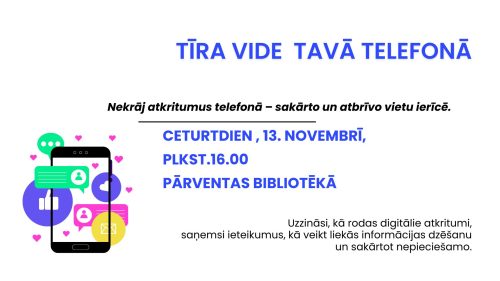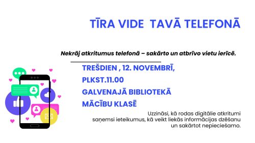 Bezmaksas tehnoloģiju apmācības senioriem. Individuālās apmācības viedtālruņa, datora, planšetes un citu ierīču un programmatūru lietošanā. Sīkāka informācija un iepriekšēja pieteikšanās, zvanot pa tālruni 22030982.