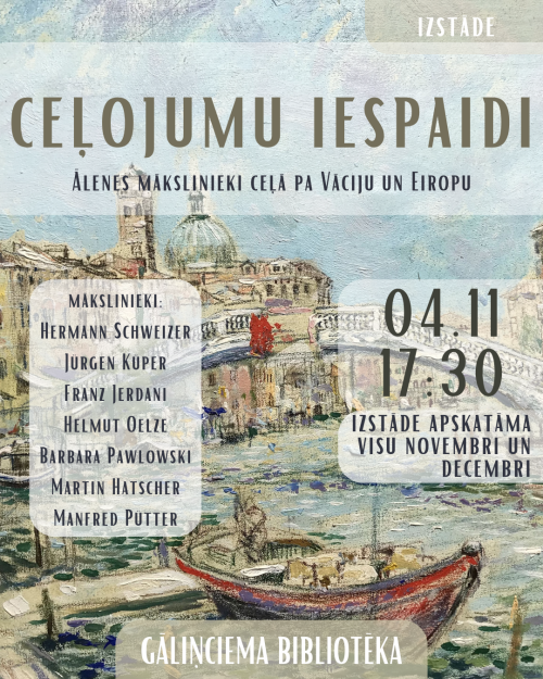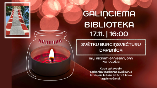Svētku burciņsvečturu darbnīca Kopā gatavosim sarkanbaltsarkanus svečturus, lai izgaismotu latviskās krāsās ietērpto koku pie Gāliņciema bibliotēkas. Mīļi gaidīti gan bērni, gan pieaugušie! Uz vietas pieejamo burciņu skaits ierobežots, tādēļ dalībnieki aicināti ierasties, līdzi ņemot...