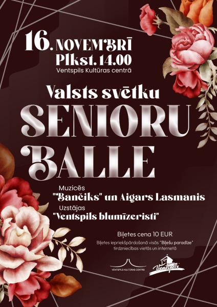 16.novembrī plkst. 14.00 Ventspils Kultūras centrs aicina seniorus uz īpašo Valsts svētku balli, kurā par svētku atmosfēru rūpēsies visu iemīļotie mūziķi Aigars Lasmanis un “Bančiks”, bet ar tematiskiem priekšnesumiem priecēs “Ventspils Blumīzeristi”. Sagaidot Valsts...