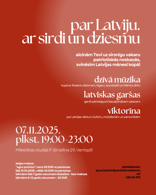 Tuvojoties Latvijas Republikas proklamēšanas gadadienai, ventspilnieki un pilsētas viesi laipni aicināti uz svinīgo Valsts svētku balli, kas norisināsies 15. novembrī no plkst. 21.00 līdz 01.00 Ventspils Kultūras centrā. Par īpaši sirsnīgu, enerģisku un latviskām...