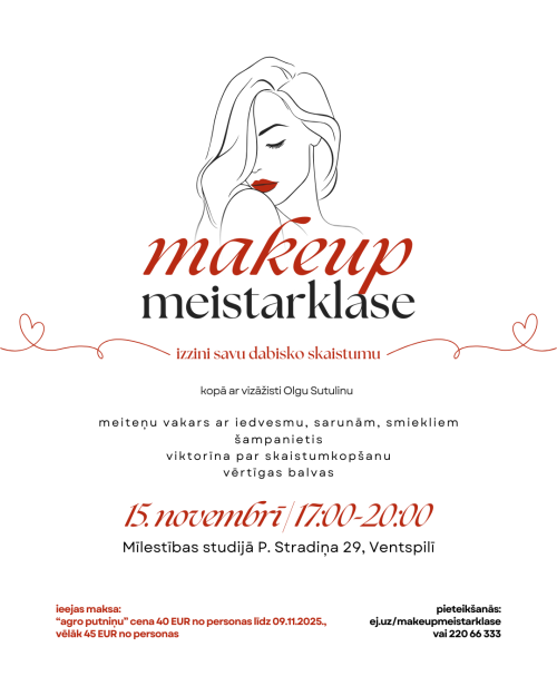 Sieviešu vakars, kurā mirdzēt no iekšienes un ārienes. Aicinām Tevi uz makeup meistarklasi, kur kopā mācīsimies izcelt dabisko skaistumu, atklāt meikapa noslēpumus un dalīties labsajūtā. Kopā ar draudzeni, māsu vai mammu — uzdāvini sev...