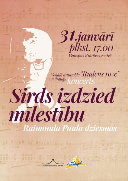 31. janvārī plkst. 17.00 Ventspils Kultūras centrā notiks tradicionālais vokālo ansambļu sadziedāšanās koncerts “Sirds izdzied mīlestību”, kas šogad tiek veltīts Maestro Raimonda Paula mūzikai – dziesmām, kas jau gadu desmitiem ir neatņemama Latvijas sirdsbalss....