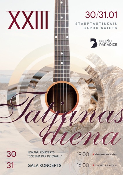 31.janvārī plkst.16.00 koncertzālē “Latvija” notiks Starptautiskā bardu saieta “Tatjanas diena” – Gala koncerts. XXIII Starptautiskā bardu saietā uzstāsies autori – izpildītāji no Ventspils, Talsiem, Rīgas, Pērnavas, Tallinas, Viļņas, Pontevedras, Kijivas, Petah Tikvas, Bidgošča, Prāgas,...