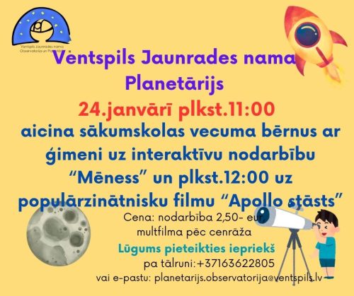 Planetārijs 24. janvārī plkst. 11.00 aicina ģimenes uz izzinošu nodarbību “Mēness”. Nodarbība paredzēta sākumskolas vecuma bērniem un viņu ģimenēm, piedāvājot aizraujošu iespēju iepazīt Zemes vienīgo dabīgo pavadoni – Mēnesi. Tās laikā dalībnieki uzzinās par...