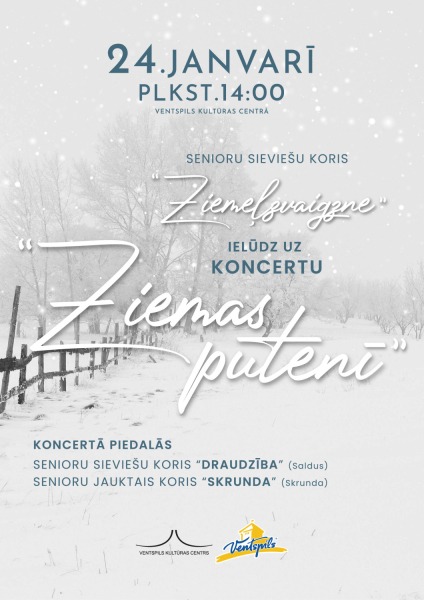 24. janvārī plkst. 14.00 Ventspils Kultūras centrā senioru sieviešu koris “Ziemeļzvaigzne” aicina visus mūzikas cienītājus uz sadziedāšanās koncertu “Ziemas putenī”, kas pulcēs dziedošus draugus no dažādām Latvijas vietām. Kora “Ziemeļzvaigzne” dalībnieces aicinājušas pie sevis...