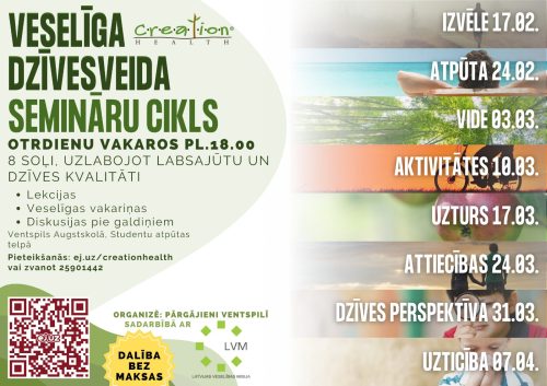 No š.g. 17. februāra līdz 7. aprīlim otrdienu vakaros pl.18.00 aicinām pievienoties veselīga dzīvesveida semināru ciklam Creation Health (Radīšanas veselība). Šajās tikšanās reizēs varēsiet baudīt veselīgas, vieglas vakariņas, interaktīvas lekcijas, kurās tiks aplūkoti 8 veselīga dzīvesveida...
