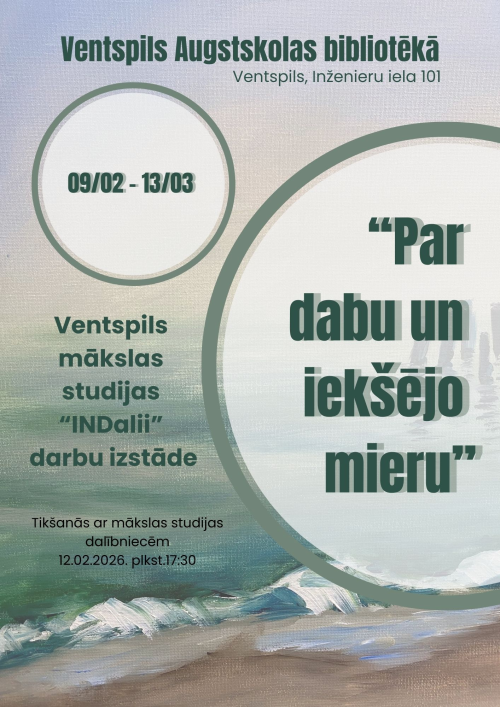 12.februārī plkst. 17.30 Augstskolas bibliotēkā būs iespējams tikties ar mākslas izstādes “Par dabu un iekšējo mieru” radītājām – dalībniecēm no Ventspils mākslas “INDalii”.