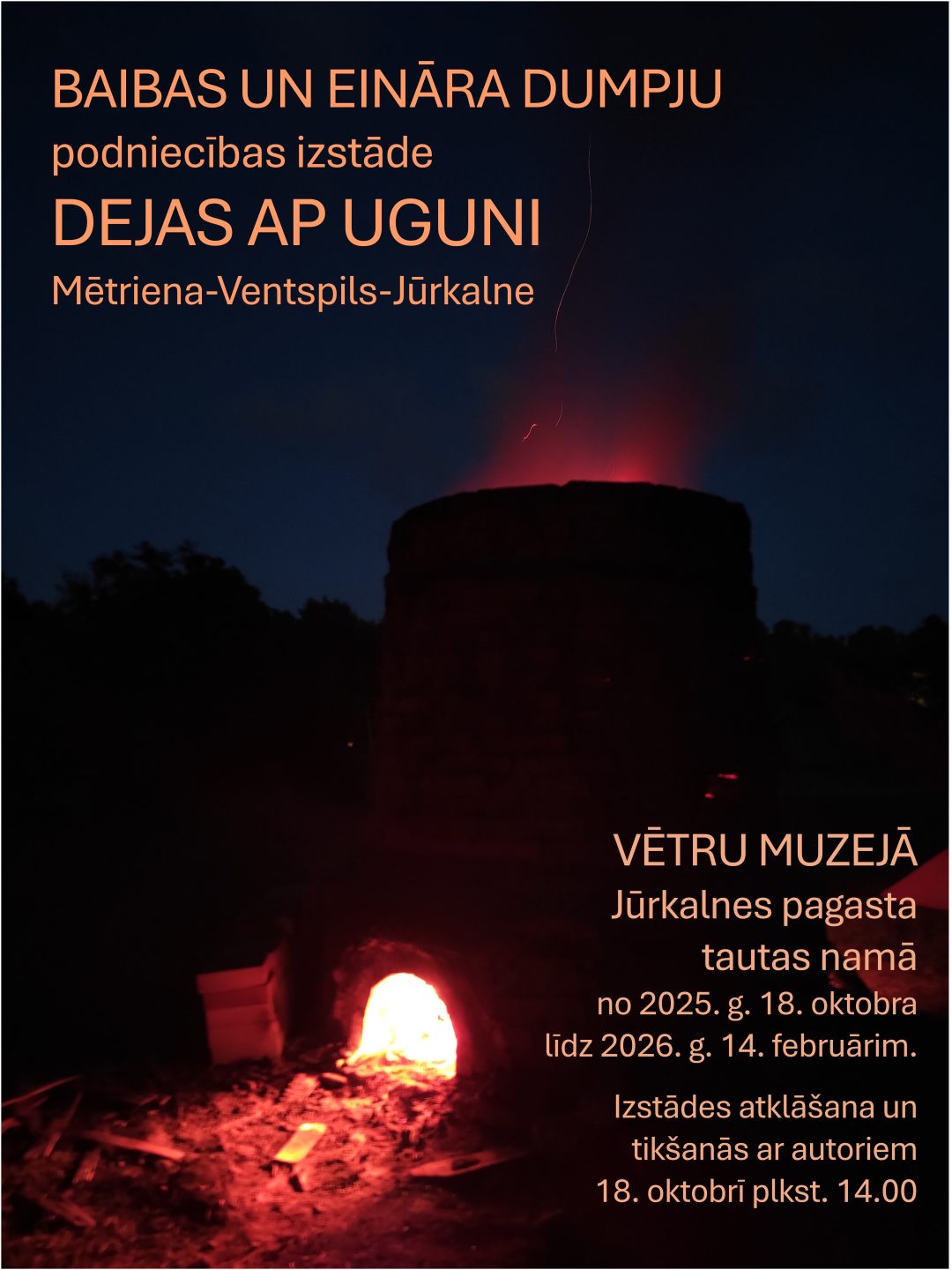 No 18. oktobra Jūrkalnes pagasta Vētru muzejā būs apskatāma Baibas un Eināra Dumpju podniecības izstāde “Dejas ap uguni. Mētriena – Ventspils – Jūrkalne”. Izstādes atklāšana un tikšanās ar autoriem norisināsies 18. oktobrī plkst. 14.00.