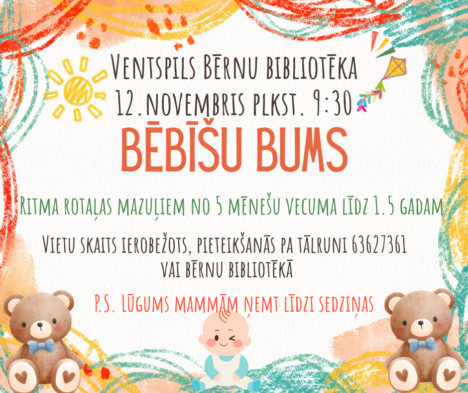 “Bēbīšu bums”. Ritma rotaļas mazuļiem no 5 mēnešu vecuma līdz pusotram gadam divas reizes mēnesī. Vietu skaits ierobežots, pieteikšanās pa tālruni 63627361. Lūgums mammām ņemt līdzi sedziņas.