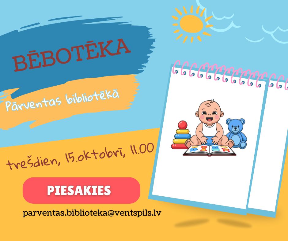 “Bēbotēka – bēbīšu bibliotēka”. Pasākuma mērķauditorija ir vecāki ar mazuļiem vecumā no 10 mēnešiem līdz 1,5 gadam.