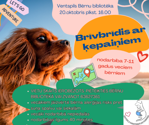 Nodarbība ar Ventspils kanisterapijas suņiem 7-11 gadus veciem bērniem “Brīvbrīdis ar ķepaiņiem”. Vietu skaits ierobežots, pieteikšanās Bērnu bibliotēkā vai pa tālruni 63627361. Vecākiem jāizvērtē bērna alerģijas risks pret suņa spalvu vai siekalām. Vecāki nodarbībā nepiedalās.…