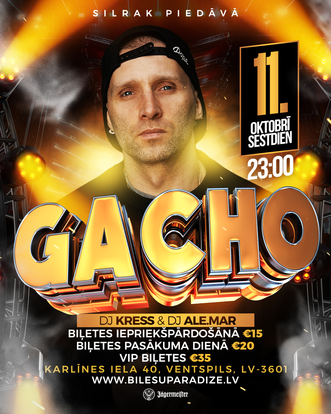 Šis mākslinieks komentārus neprasa. 11.OKTOBRĪ, SESTDIEN – uzstāsies hiphopa leģenda: GACHO. Bet karstākos ballīšu hitus iegriezīs labākie no labākajiem: DJ KRESS & DJ ALE.MAR. Šis viennozīmīgi būs viens no iespaidīgākajiem pasākumiem Ventspilī.