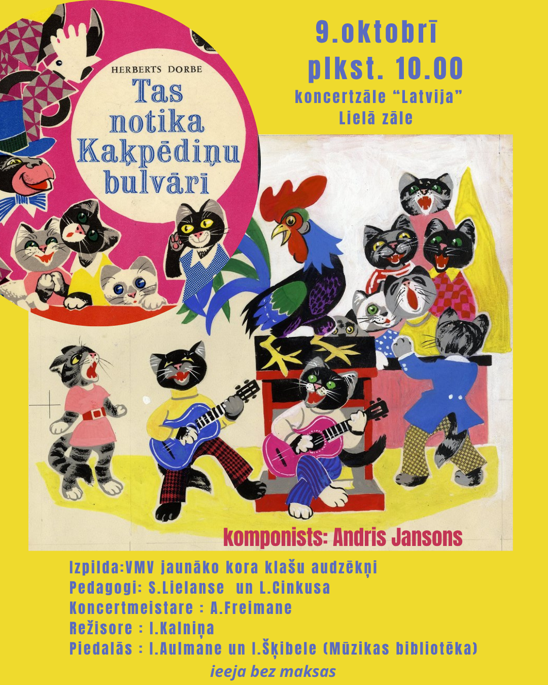 Ceturtdien, 9. oktobrī, plkst. 10.00, koncertzāles “Latvija” lielajā zālē izskanēs Ventspils Mūzikas skolas jaunāko klašu kora klases audzēkņu priekšnesums. Jaunie dziedātāji izpildīs fragmentus no Andra Jansona komponētā mūzikla pēc Herberta Dorbes stāsta “Tas notika kaķpēdiņu bulvārī” motīviem.