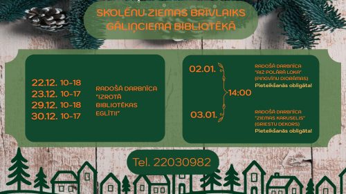 2. janvārī, plkst.14.00 Gālinciema bibliotēkā notiks skolēnu brīvlaika radošā darbnīca “Aiz polārā loka”. No dažādiem materiāliem veidosim pingvīnu diorāmu. Obligāta pieteikšanās pa tālr. 22030982. Vietu skaits ierobežots.