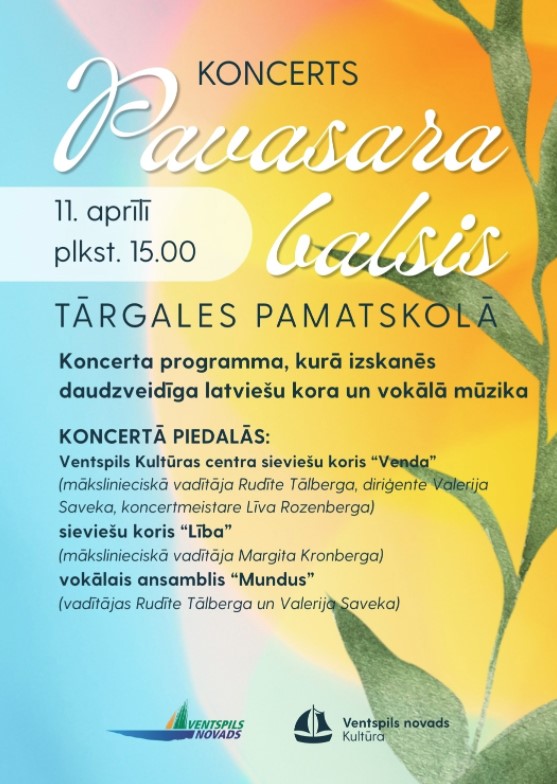 11. aprīlī plkst. 15.00 Tārgales pamatskolas aktu zālē notiks koncerts “Pavasara balsis”. Tajā klausītājus priecēs Ventspils Kultūras centra mākslinieciskie kolektīvi. Programmā izskanēs daudzveidīga latviešu kora un vokālā mūzika.