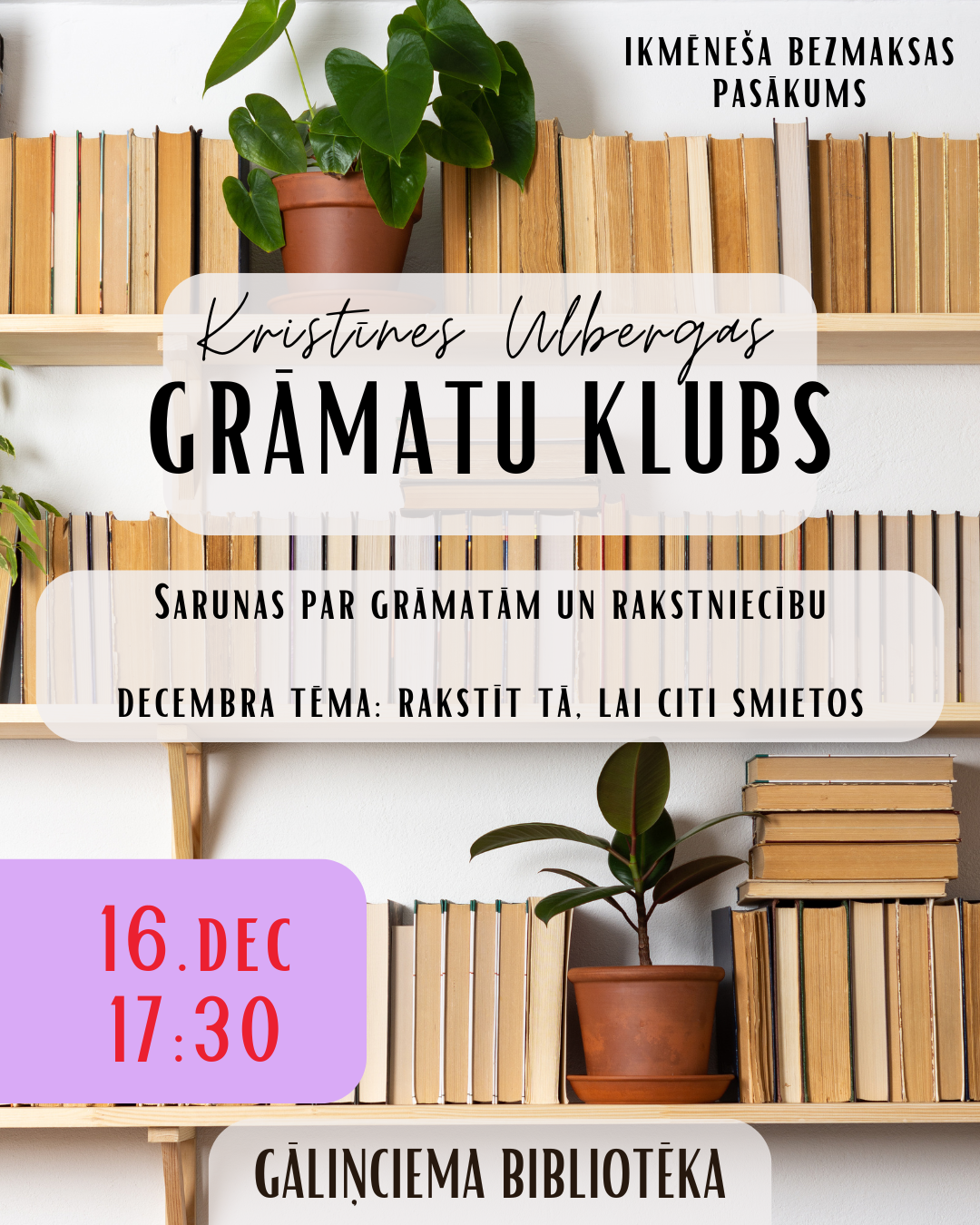 Kristīnes Ulbergas grāmatu klubs. Sarunas par grāmatām un rakstniecību pie tējas. Tēma: rakstīt tā, lai citi smietos. Aicināti visi interesenti, priekšzināšanām nav jābūt.