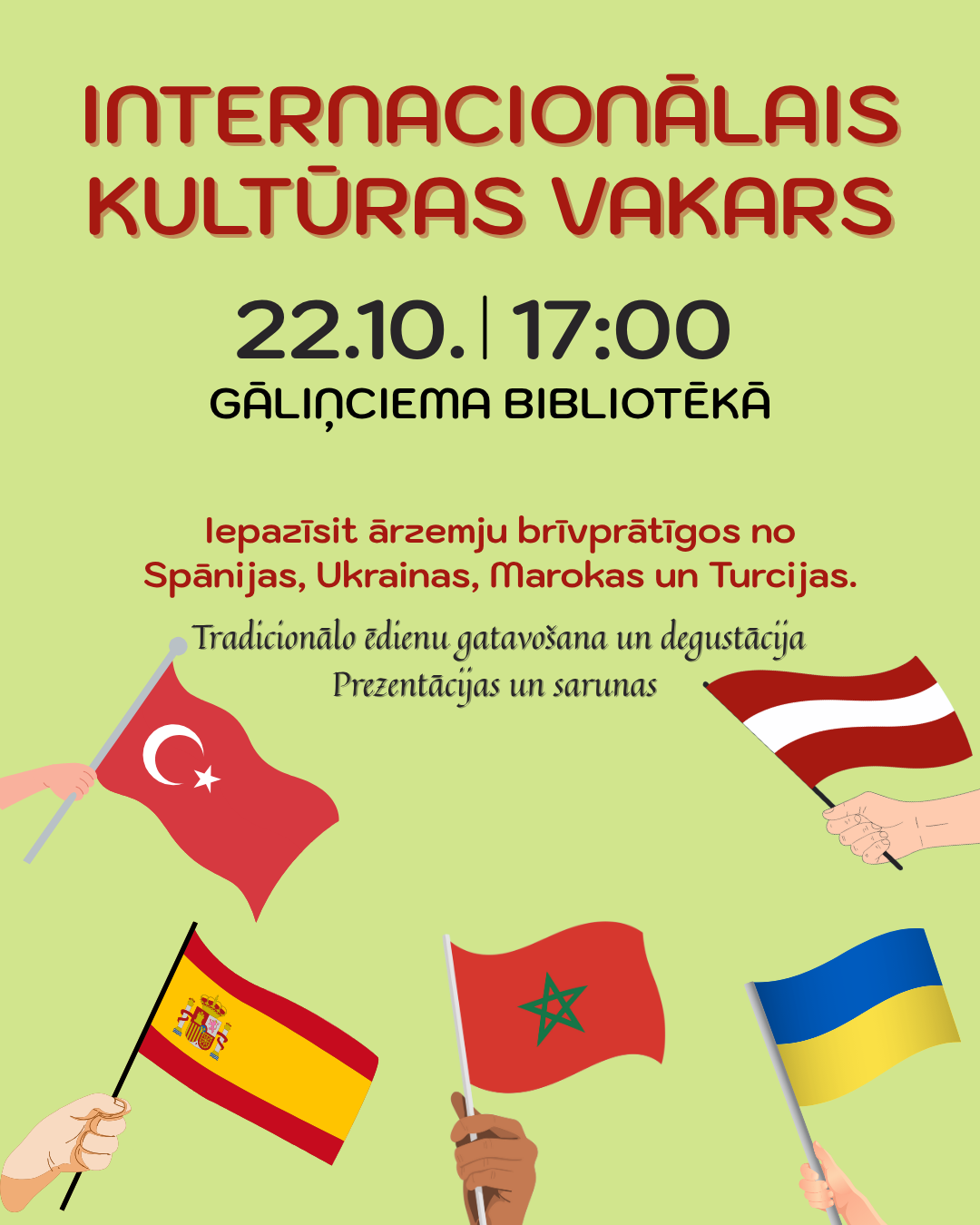 Internacionālais kultūras vakars ar valstu prezentācijām, sarunām un tradicionālo ēdienu gatavošanu un degustāciju sadarbībā ar Ventspils Jauniešu mājas brīvprātīgajiem no Spānijas, Ukrainas, Marokas un Turcijas