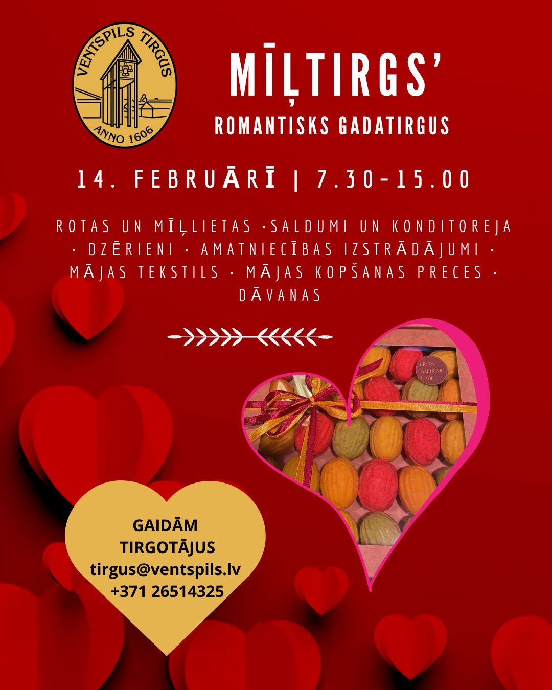 Aicinām tirgotājus piedalīties Mīļtirgū – Valentīndienas gadatirgū Ventspils tirgū! Tirgošanās notiks sestdien, 14. februārī, plkst. 7.30 – 15.00