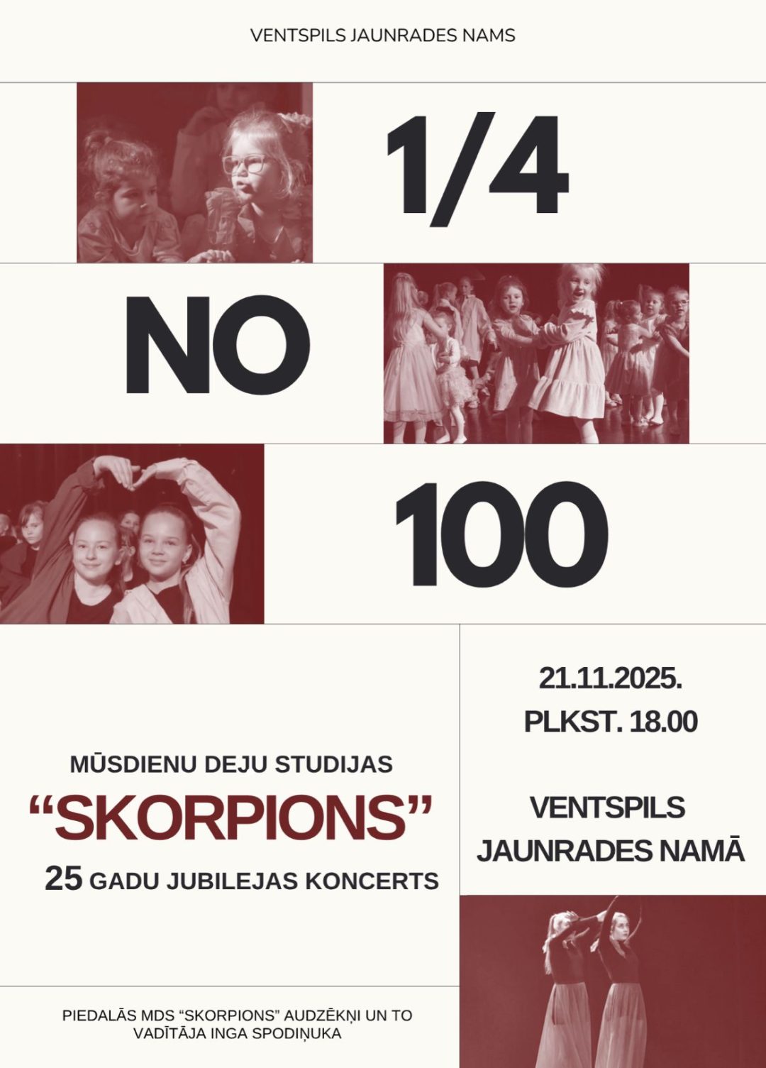 Ventspils Jaunrades nama mūsdienu deju studija “Skorpions” aicina uz koncertu “Viena ceturtdaļa no 100”.