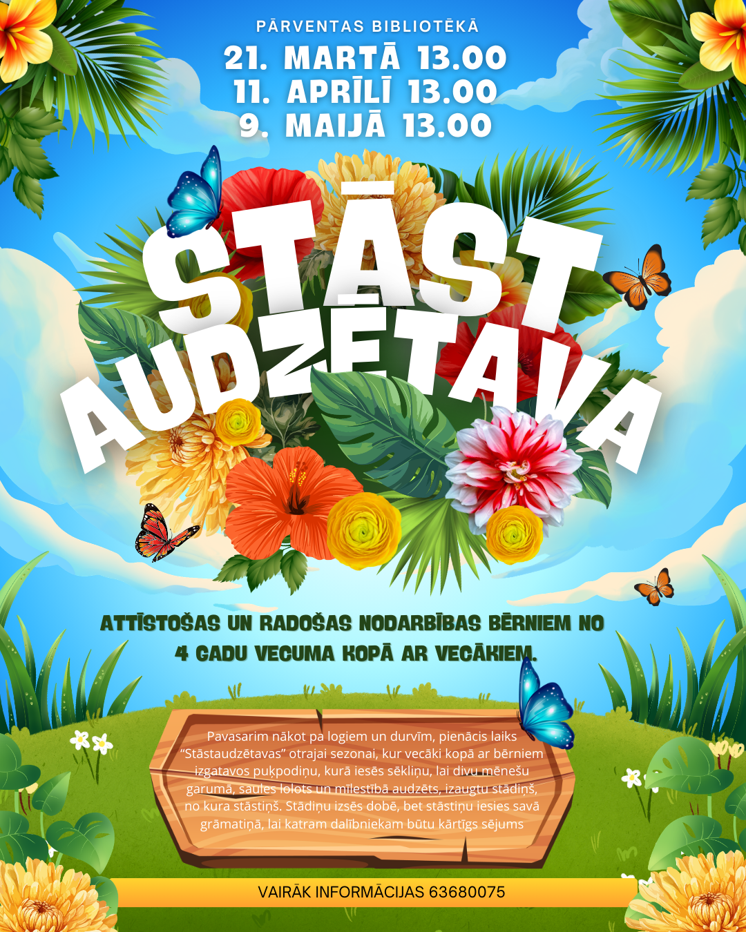 Plānotas trīs „Stāstaudzētavas” nodarbības, kurās bērni darbosies kopā ar saviem vecākiem. Pirmajā nodarbībā, 21. martā, dalībnieki noklausīsies stāstu par dārza veidošanu, veidos augiem podiņus un iesēs sēkliņas. Otrajā nodarbībā, 11. aprīlī, izpētīs, kādi augi aug dobēs, un aplicēs dārza ainavu. Savukārt trešajā nodarbībā, 9. maijā, skatīsies, kas podiņos ir izaudzis, dos augiem vārdus un veidos par tiem grāmatiņu.