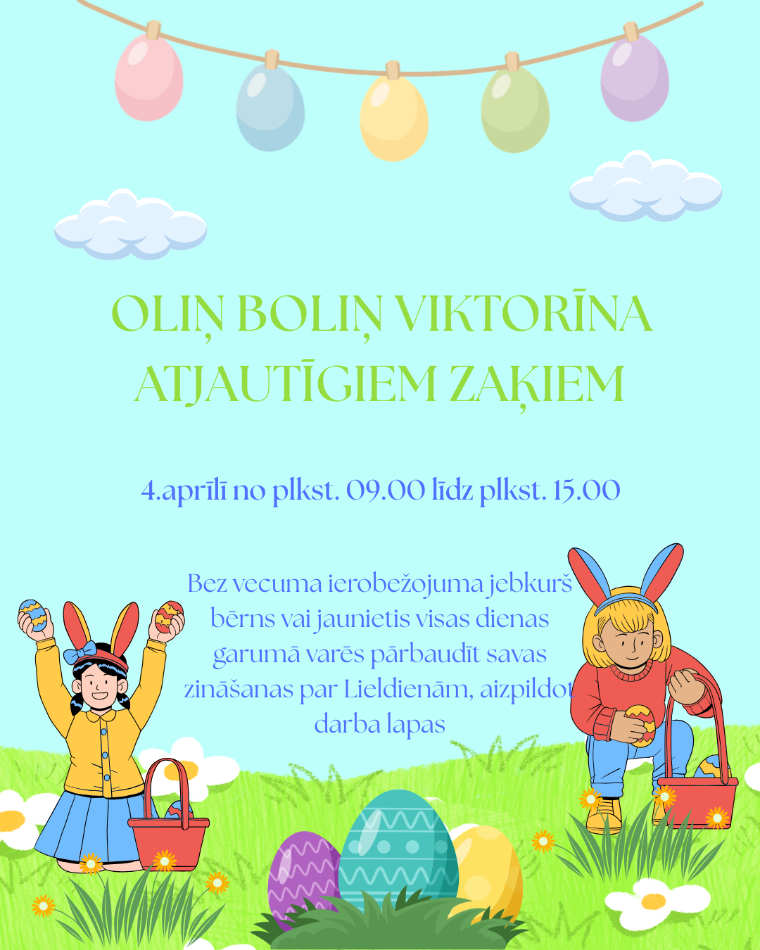 Sestdien, 4. aprīlī visas dienas garumā Bērnu bibliotēkā notiks pasākums “Oliņ Boliņ viktorīna atjautīgajiem zaķiem”. No 9.00 līdz 15.00 bērni un jaunieši varēs pārbaudīt savas zināšanas par Lieldienām, aizpildot darba lapas.