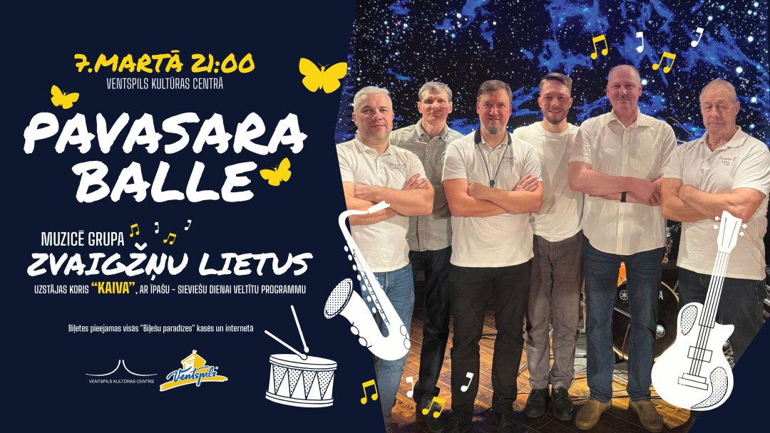 7. martā plkst. 21.00 Ventspils Kultūras centrā norisināsies Pavasara balle. Par muzikālo noformējumu rūpēsies grupa “Zvaigžņu lietus”, savukārt īpašu – Starptautiskajai sieviešu dienai veltītu programmu apmeklētājiem dāvinās jauktais koris “Kaiva” (diriģente Ginta Rūse).