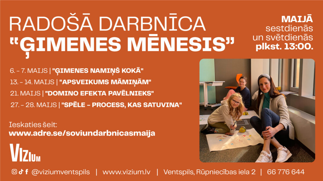 Radoša atpūta ģimenes lokā ir lielisks veids, kā izklaidēties un vienlaikus saliedēt un stiprināt saikni starp ģimenes locekļiem, tāpēc Ventspils zinātnes centrs VIZIUM regulāri piedāvā dažādas radošas aktivitātes, lai veicinātu sirsnīgu un vienlaikus izzinošu kopā būšanu. Maijā zinātnes centra VIZIUM radošo darbnīcu tēma būs “Ģimenes mēnesis”.