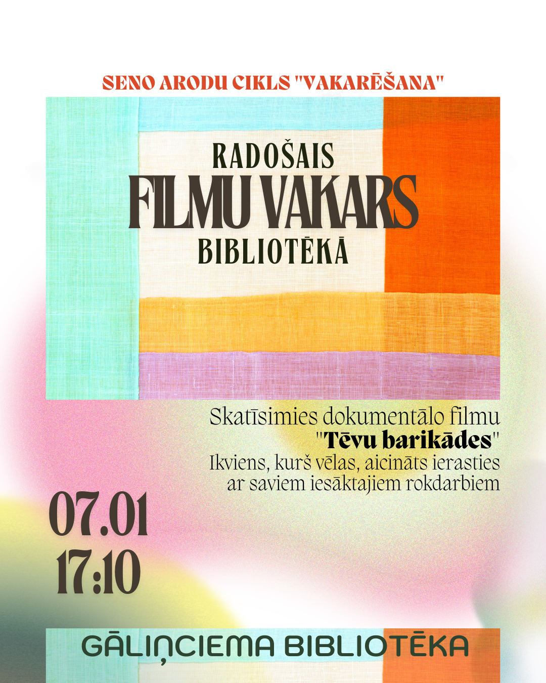 Skatīsimies dokumentālo filmu “Tēvu barikādes”. Ikviens, kurš vēlas, aicināts ierasties ar saviem iesāktajiem rokdarbiem. Aktivitātes dažādiem vecumiem.