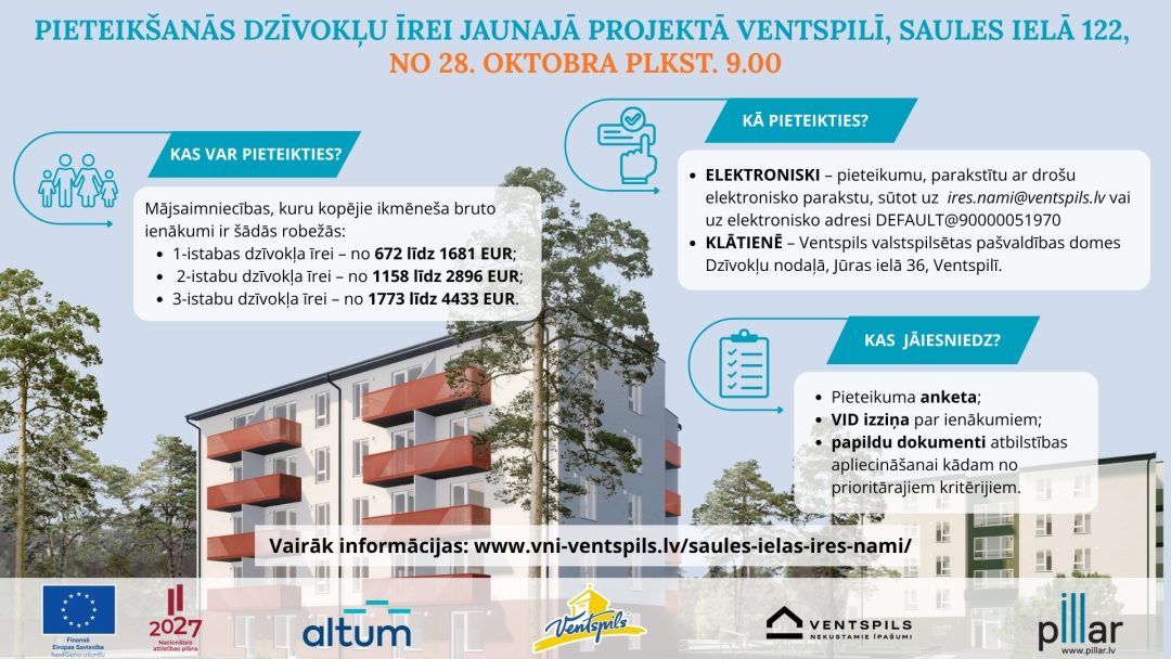 Pieteikumu dzīvokļu īrei mājās Saules ielā 122, Ventspilī, var iesniegt no 2025. gada 28. oktobra elektroniski, parakstītu ar drošu elektronisko parakstu, nosūtot uz e-pasta adresi [email protected] vai uz Ventspils domes administrācijas oficiālo elektronisko adresi DEFAULT@90000051970, vai klātienē Ventspils valstspilsētas domes Dzīvokļu nodaļā Jūras ielā 36, Ventspilī, domes administrācijas darba laikā – pirmdienās no plkst. 8 līdz 18, otrdienās, trešdienās un ceturtdienās no plkst. 8 līdz 17, piektdienās – no plkst. 8 līdz 16 (pusdienu pārtraukums no plkst. 12 līdz 13).