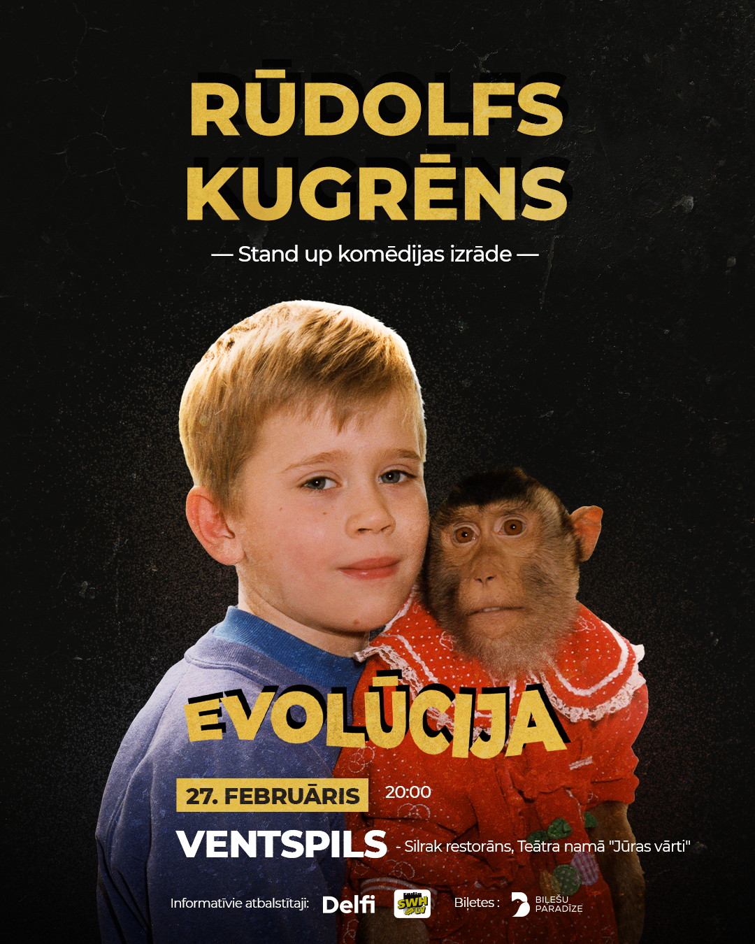 Viens no Latvijas zināmākajiem stand up komiķiem Rūdolfs Kugrēns nāk klajā ar savu jaunāko izrādi “Evolūcija”. Tajā Rūdolfs vienas lustīgas stundas garumā iepriecinās publiku ar aizraujošiem stāstiem par tādām valstiski svarīgām tēmām kā TV šovs “Karsti Krēta”, Latvijas futbola izlases panākumi, neprognozējamais bērnudārza “Whatsapp” čats un ieteikumiem kā pareizi izlietot teju beigušās dāvanu kartes.