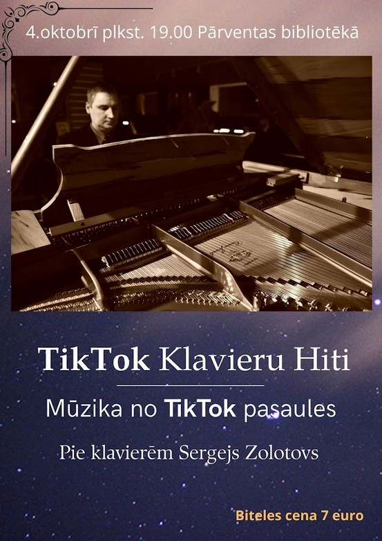 - oktobrī plkst. 19.00 Pārventas bibliotēkā aicinām doties īpašā muzikālā ceļojumā. Šajā vakarā dzirdēsim kompozīcijas, kas kļuvušas par daļu no mūsu digitālās kultūras, taču ne radio vai televīzijā, bet gan TikTok. Miljoni un pat miljardi video — no dejām un jokiem līdz sirsnīgiem stāstiem — padarījuši šīs melodijas par pasaules fenomenu. Tagad tās atklāsim citādi: klavieru skanējumā, kādā tās reiz tika radītas.