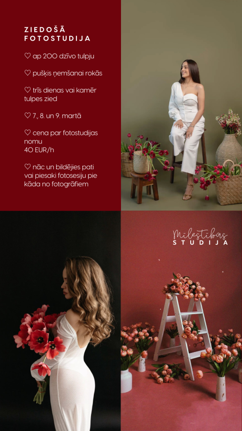 No 7. līdz 9. martam “Mīlestības studija” aicina uz īpašu pavasara fotogrāfēšanās pieredzi — ziedošo fotostudiju, kurā interjeru piepildīs vairāk nekā 200 dzīvas tulpes. Apmeklētājiem ir iespēja nomāt studiju patstāvīgai fotografēšanai vai ierasties kopā ar…