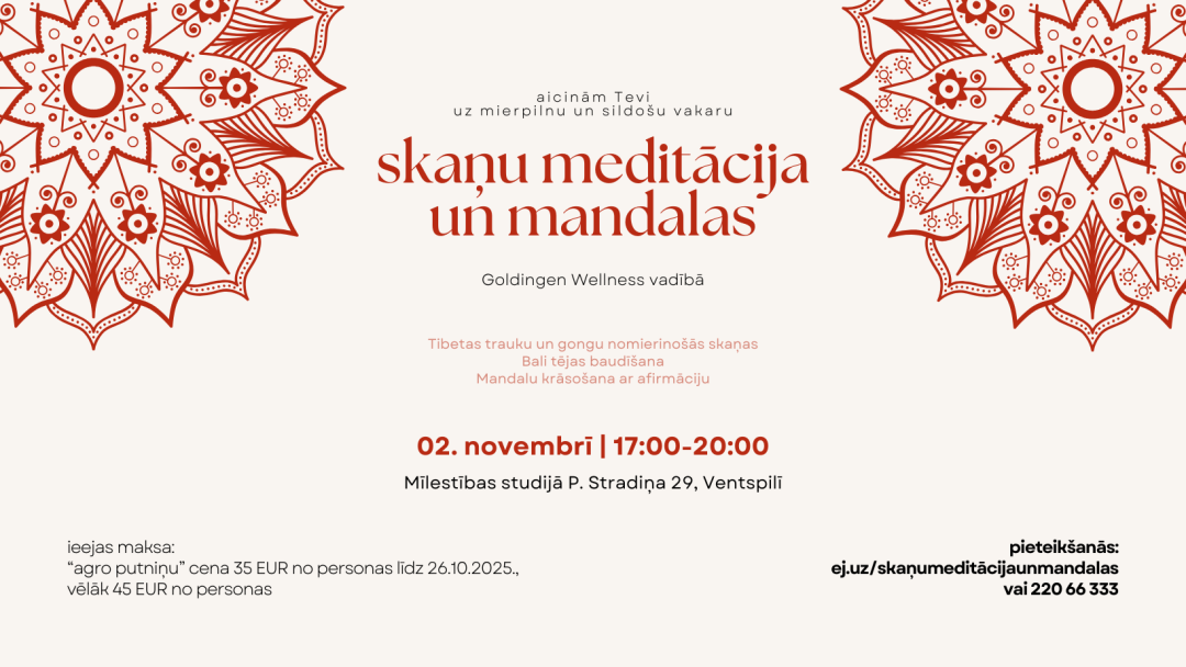 Pieteikšanās zvanot vai rakstot uz 220 66 333 vai aizpildot pieteikuma anketu šeit: ej.uz/skaņumeditācijaunmandalas