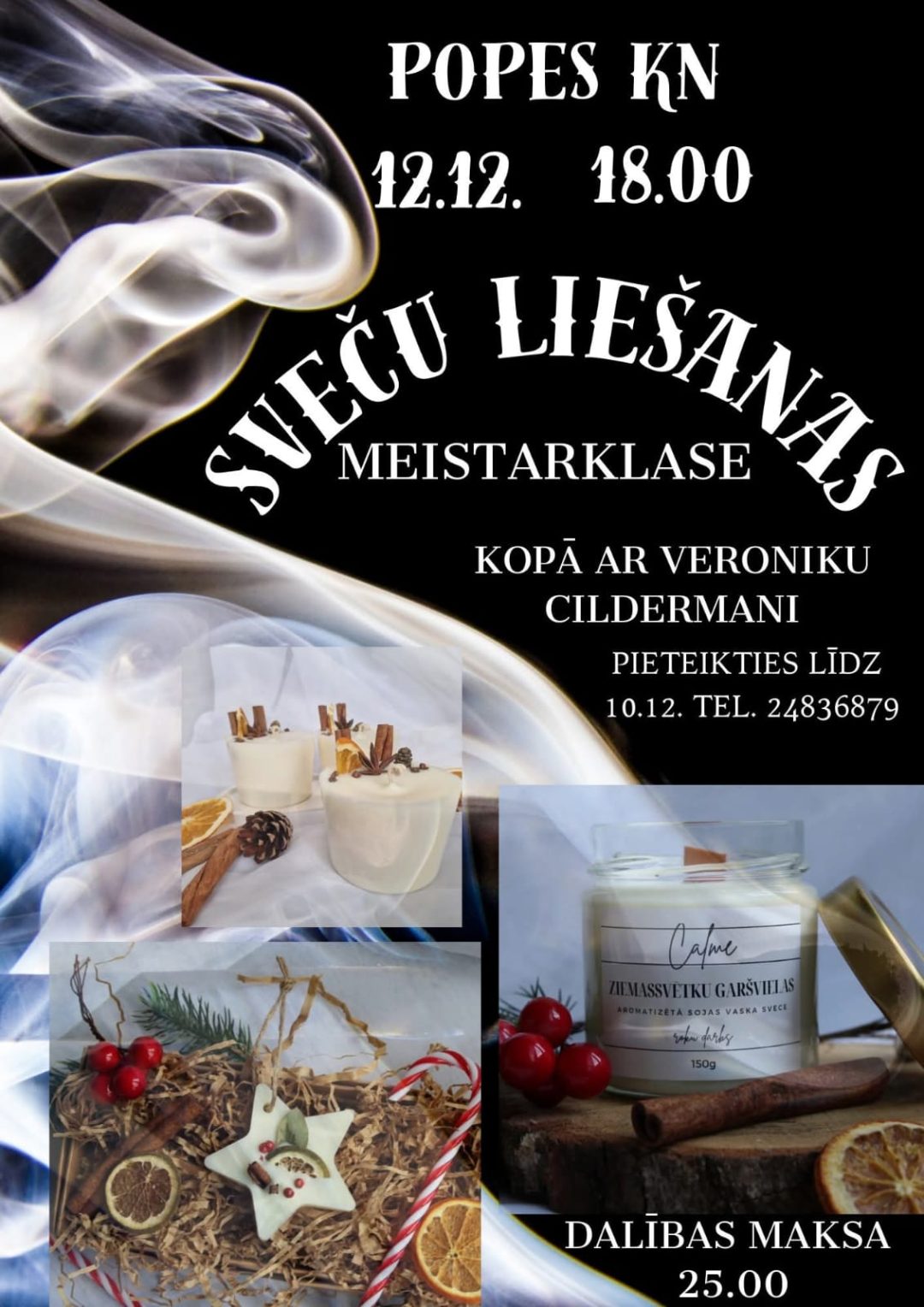 12. decembrī plkst. 18.00 Popes kultūras namā notiks sveču liešanas meistarklase, kurā tiks izgatavotas aromātiskās sveces burciņā ar koka dakti, aromātiskā vaska plāksnītes un svecītes, kuru varēs dekorēt pēc sirds patikas. Sveču liešanai tiks izmantots dabisks sojas vasks.