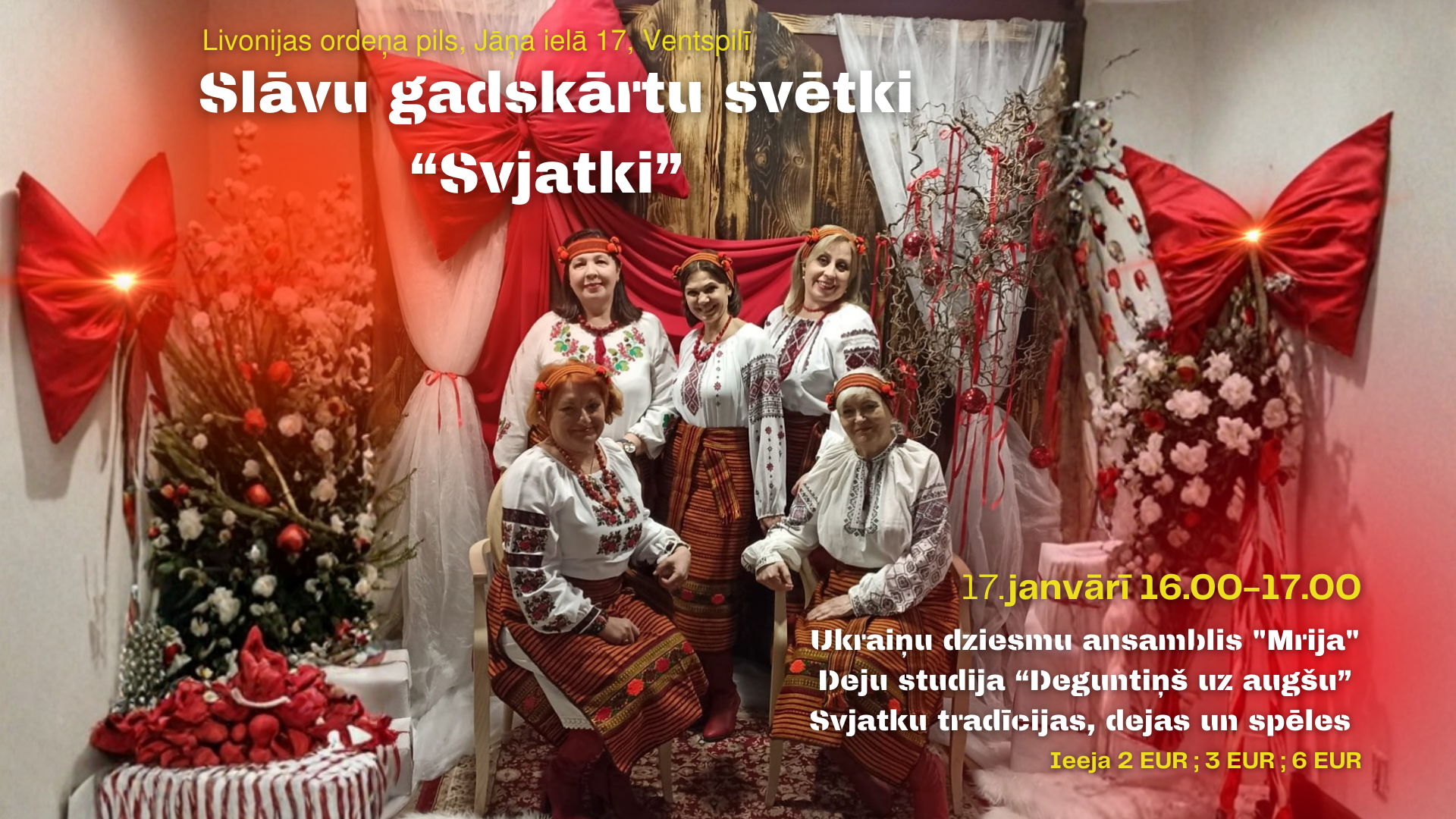 Ukraiņu dziesmu ansamblis “Mrija” dzied tautasdziesmas un Ziemassvētku laika dziesmas, deju studija “Deguntiņš uz augšu” priecē ar dejām.