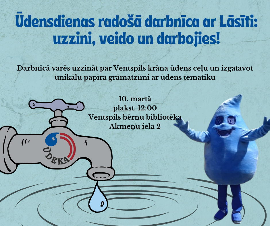 “Ūdens dienas radošā darbnīca ar Lāsīti: uzzini, veido un darbojies!” Darbnīcā varēs uzzināt par Ventspils krāna ūdens ceļu un izgatavot unikālu papīra grāmatzīmi ar ūdens tematiku. Tāpat būs iespēja izmēģināt spēkus, saliekot cauruļu cilvēciņu, kā arī baudīt Ventspils krāna ūdeni un satikt draudzīgo Lāsīti.