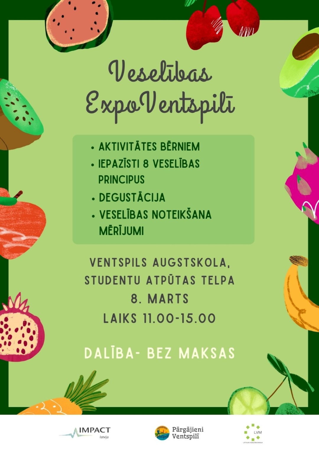 Veselības izstāde par 8 veselības principiem. Pasākuma laikā apmeklētāji varēs veikt dažādus veselības mērījumus: