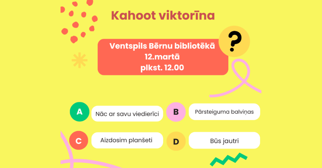 12. martā plkst. 12.00 Bērnu bibliotēkā pārbaudīsim savas zināšanas dažādās viktorīnās Kahoot platformā.