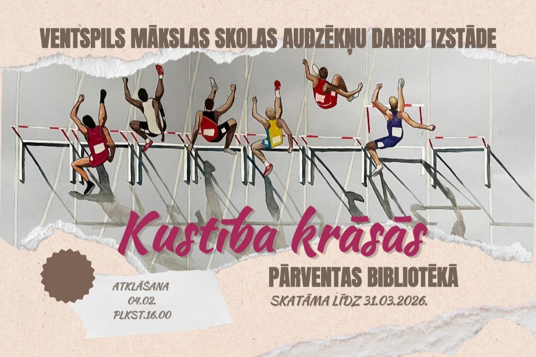 4.februārī plkst. 16.00 Pārventas bibliotēkā notiks Ventspils Mākslas skolas audzēkņu radošo darbu izstādes “Kustība krāsās”  atklāšana, kurā  interesenti varēs tikties ar darbu autoriem, aplūkot izstādi, skatīties bērnu radīto animāciju un izjust kustību ritmus, kā arī sajust krāsu enerģiju un ļauties kustībai, kas dzimst mākslā.
